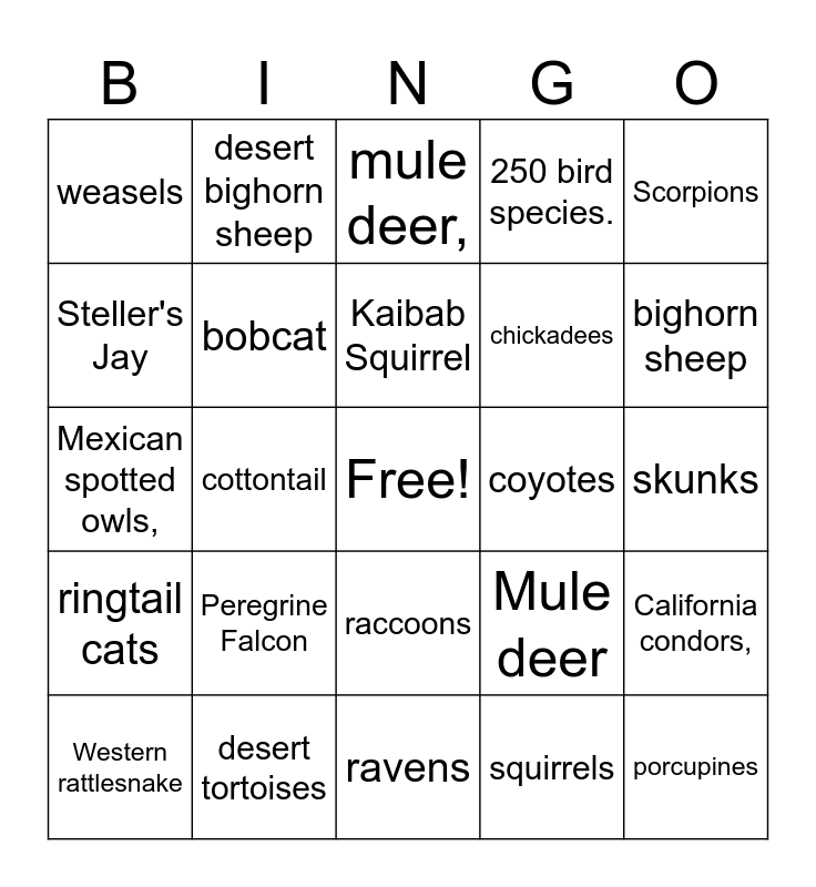 This bingo card has a free space and 27 words: Mule deer, Utah prairie dogs, chickadees, ravens, Steller's Jay, mule deer,, desert bighorn sheep, ringtail cats, coyotes, California condors,, Mexican spotted owls,, 250 bird species., Western rattlesnake, desert tortoises, bighorn sheep, ringtail cat, bobcat, Kaibab Squirrel, Peregrine Falcon, weasels, skunks, squirrels, cottontail, porcupines, raccoons, Scorpions and Black Bears.