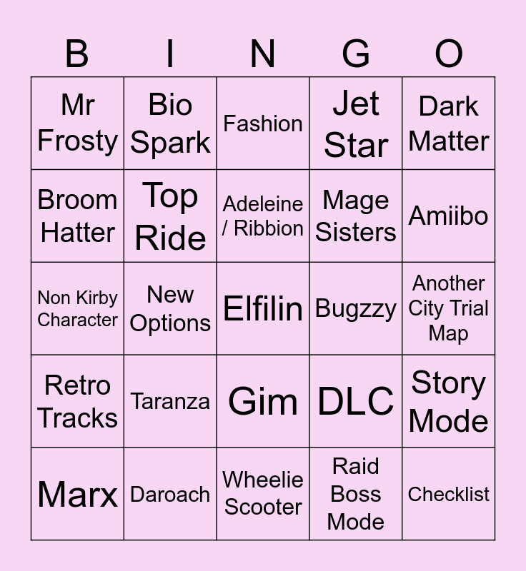 This bingo card has a free space and 24 words: Taranza, Daroach, Adeleine / Ribbion, Marx, Dark Matter, Mr Frosty, Broom Hatter, Bio Spark, Bugzzy, Gim, Mage Sisters, Non Kirby Character, DLC, Story Mode, Top Ride, Raid Boss Mode, Another City Trial Map, Fashion, Amiibo, New Options, Checklist, Retro Tracks, Jet Star and Wheelie Scooter.