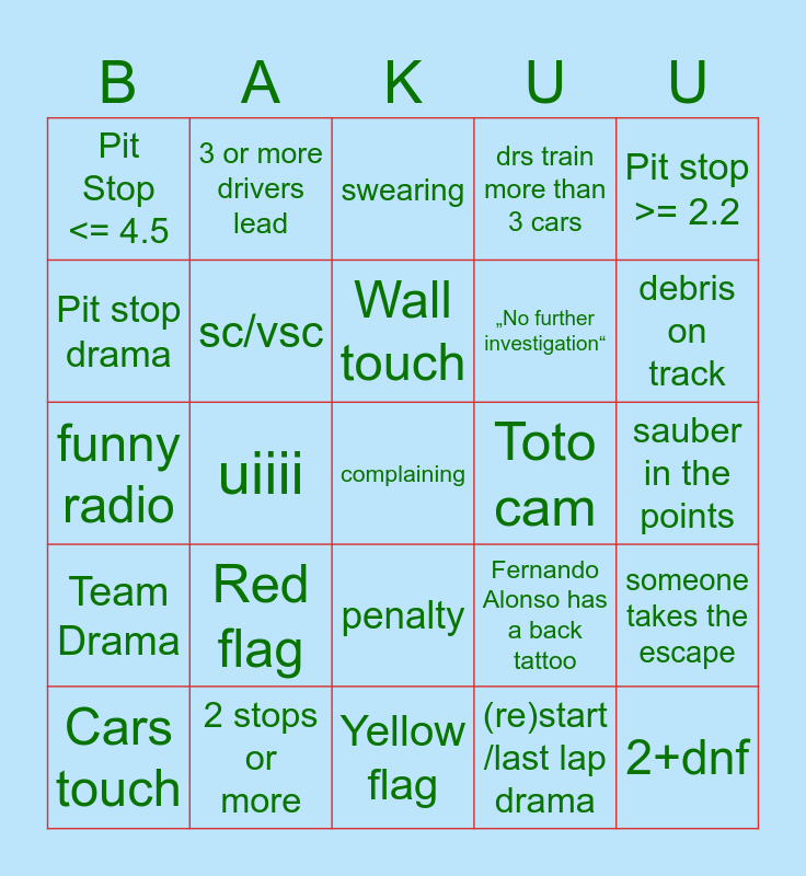 This bingo card has 25 words: Red flag, Yellow flag, Wall touch, Cars touch, Pit stop >= 2.2, Pit Stop <= 4.5, Pit stop drama, 3 or more drivers lead, Toto cam, penalty, โNo further investigationโ, funny radio, Fernando Alonso has a back tattoo, someone takes the escape, sc/vsc, 2+dnf, sauber in the points, swearing, debris on track, uiiii, complaining, 2 stops or more, Team Drama, drs train more than 3 cars and (re)start /last lap drama.