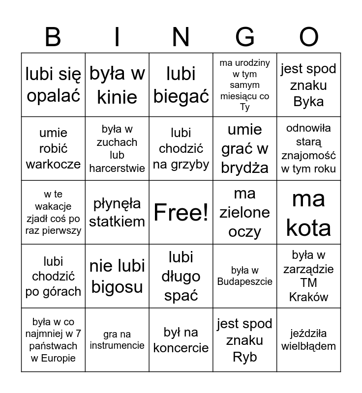 This bingo card has a free space and 45 words: leciała balonem, jeździła wielbłądem, była na przynajmniej 2 kontynentach, była w co najmniej w 7 państwach w Europie, jeździ na nartach, jest spod znaku Ryb, lubi biegać, jeździ na desce, jest spod znaku Byka, gra na instrumencie, ma urodziny w tym samym miesiącu co Ty, ma zielone oczy, lubi długo spać, nie lubi bigosu, woli morze od gór, był na koncercie, przeczytał minimum dwie książki w tym roku, w te wakacje zjadł coś po raz pierwszy, tańczyła tego lata, odnowiła starą znajomość w tym roku, była w kinie, lubi śpiewać, zjadła Kebaba w środę, lubi się opalać, ma takie samo hobby jak Ty, ma kota, ma psa, była w Gdańsku, była w Budapeszcie, lubi chodzić po górach, była na ostatnim wyjeździe integracyjnym, była w zarządzie TM Kraków, jeździła konno, obejrzała nowy serial w wakacje, lubi gotować, płynęła statkiem, nie umie pływać, pracowała w stowarzyszeniu, nie była Toastmasterem, lubi chodzić na grzyby, umie robić warkocze, umie grać w brydża, robiła różne przetwory, była w zuchach lub harcerstwie and chce wystąpić na Ted'ex.