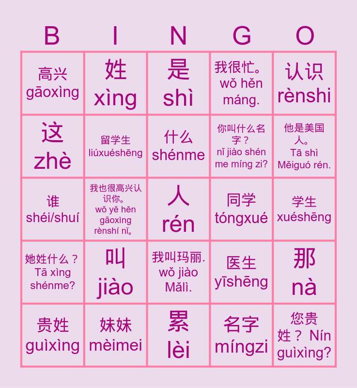 This bingo card has a free space and 24 words: 贵姓 guìxìng, 叫 jiào, 什么 shénme, 名字 míngzi, 认识 rènshi, 高兴 gāoxìng, 姓 xìng, 是 shì, 同学 tóngxué, 学生 xuéshēng, 谁 shéi/shuí, 留学生 liúxuéshēng, 医生 yīshēng, 那 nà, 这 zhè, 妹妹 mèimei, 累 lèi, 我很忙。 wǒ hěn máng., 他是美国人。 Tā shì Měiguó rén., 她姓什么? Tā xìng shénme?, 我也很高兴认识你。 wǒ yě hěn gāoxìng rènshí nǐ。, 我叫玛丽. wǒ jiào Mǎlì., 你叫什么名字? nǐ jiào shén me míng zi? and 您贵姓? Nín guìxìng?.