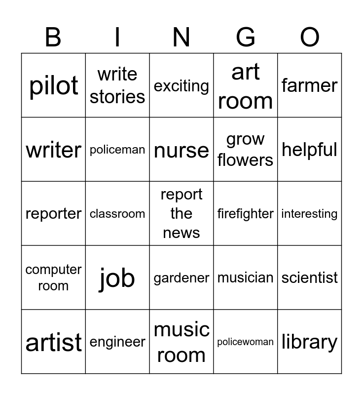 This bingo card has a free space and 24 words: job, engineer, nurse, artist, farmer, pilot, writer, write stories, firefighter, gardener, grow flowers, reporter, musician, scientist, policeman, policewoman, interesting, exciting, helpful, classroom, library, computer room, art room and music room.
