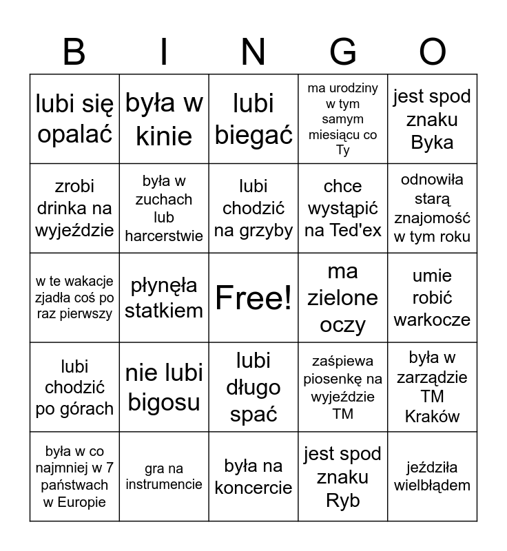This bingo card has a free space and 45 words: leciała balonem, jeździła wielbłądem, była na przynajmniej 2 kontynentach, była w co najmniej w 7 państwach w Europie, jeździ na nartach, jest spod znaku Ryb, lubi biegać, jeździ na desce, jest spod znaku Byka, gra na instrumencie, ma urodziny w tym samym miesiącu co Ty, ma zielone oczy, lubi długo spać, nie lubi bigosu, woli morze od gór, była na koncercie, przeczytała minimum dwie książki w tym roku, w te wakacje zjadła coś po raz pierwszy, tańczyła tego lata, odnowiła starą znajomość w tym roku, była w kinie, lubi śpiewać, zjadła kebaba w środę, lubi się opalać, ma takie samo hobby jak Ty, umie robić warkocze, nie umie pływać, opowie kawał lub dowcip na wyjeździe TM, zaśpiewa piosenkę na wyjeździe TM, lubi chodzić po górach, była na ostatnim wyjeździe integracyjnym, była w zarządzie TM Kraków, jeździła konno, obejrzała nowy serial w wakacje, lubi gotować, płynęła statkiem, umie grać w brydża, pracowała w stowarzyszeniu, nie była Toastmasterem, lubi chodzić na grzyby, zrobi drinka na wyjeździe, chce wystąpić na Ted'ex, robiła różne przetwory, była w zuchach lub harcerstwie and Jest na diecie.