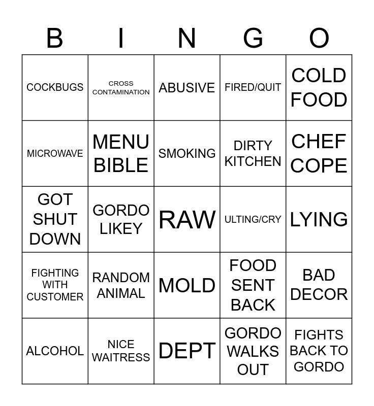 This bingo card has a free space and 24 words: RANDOM ANIMAL, NICE WAITRESS, SMOKING, ALCOHOL, COLD FOOD, COCKBUGS, MICROWAVE, CROSS CONTAMINATION, ULTING/CRY, MOLD, DIRTY KITCHEN, GOT SHUT DOWN, FOOD SENT BACK, BAD DECOR, MENU BIBLE, GORDO WALKS OUT, LYING, ABUSIVE, CHEF COPE, GORDO LIKEY, FIGHTS BACK TO GORDO, FIGHTING WITH CUSTOMER, FIRED/QUIT and DEPT.
