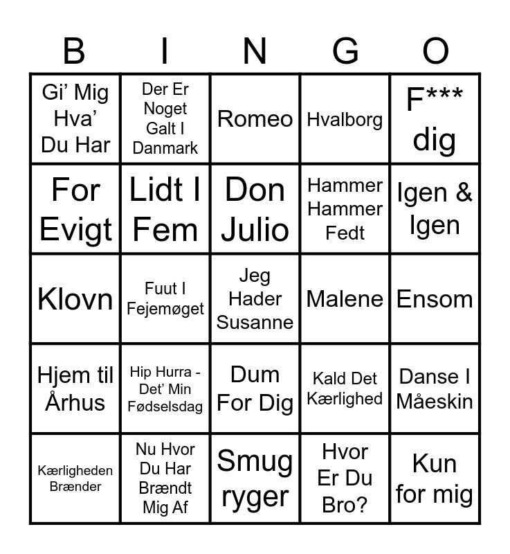 This bingo card has 67 words: Æblemand Kom I indenfor, All My Love, Brækked Dig I Busken, Danse I Måeskin, De Første Kærester På Månen, Den Jeg Elsker, Elsker Jeg., Der Er Noget Galt I Danmark, Det er hans kys, Don Julio, Drømmer Jeg, Dum For Dig, Dyb Vand, Ensom, F*** dig, Flyvende Faduma, For Evigt, Fuut I Fejemøget, Gi’ Mig Hva’ Du Har, Glemmer dig aldrig, Hammer Hammer Fedt, Hip Hurra - Det’ Min Fødselsdag, Hjem til Århus, Hvalborg, Hvor Er Du Bro?, Hvorfor Går Louise Til Bal?, Hvor længe Vil Du Ydmyge Dig?, Hvor Ska’ Vi Sove I Nat, I En Lille Båd Der Gynger, Igen & Igen, Indianer, Jeg Hader Susanne, Jeg I Live, Jeg Ka’ Rigtig Godt Li’ Dig, Jeg Vil La’ Lyset Brænde, Jutlandia, Kærligheden Brænder, Kærligheden Kalder, Kald Det Kærlighed, Klovn, Kun for mig, Lanternen, Lidt I Fem, Malene, Mest Ondt, Midt Om Natten, Min Indre Stemme, Min Pige Slikkepind, Nu Hvor Du Har Brændt Mig Af, Øde Ø, Over Byen, Romeo, Så længe jeg lever, Sexchikane, Skub Til Taget, Smil Du På, Smug ryger, Smuk som et stjerneskud, Stupid Man, Sydpå, Tænder på dig, Taxa, Tusind stykkee, Vågner i natten, Ved du hvat hun sagde, Vi gør de vi kan li, Vilde kaniner and VI to.