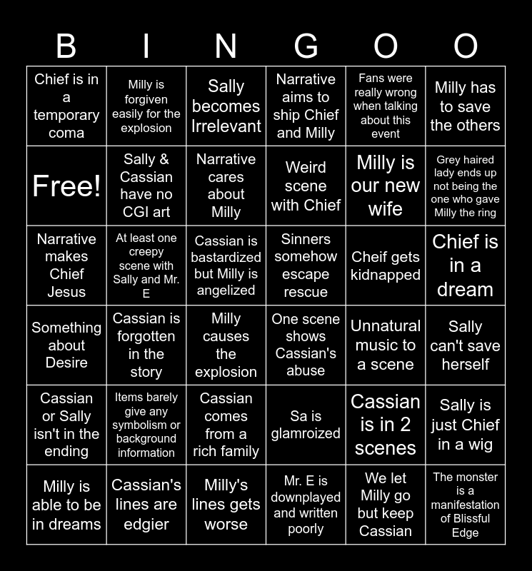 This bingo card has 36 words: Something about Desire, Cassian is forgotten in the story, Milly's lines gets worse, Weird scene with Chief, Cheif gets kidnapped, Chief is in a dream, Chief is in a temporary coma, Cassian's lines are edgier, Sally becomes Irrelevant, Sa is glamroized, Milly is our new wife, Milly has to save the others, Cassian or Sally isn't in the ending, At least one creepy scene with Sally and Mr. E, Narrative cares about Milly, Narrative aims to ship Chief and Milly, Cassian is in 2 scenes, Sally can't save herself, Free!, Sally & Cassian have no CGI art, Milly causes the explosion, One scene shows Cassian's abuse, Unnatural music to a scene, Sally is just Chief in a wig, Narrative makes Chief Jesus, Milly is forgiven easily for the explosion, Cassian is bastardized but Milly is angelized, Mr. E is downplayed and written poorly, Fans were really wrong when talking about this event, Grey haired lady ends up not being the one who gave Milly the ring, Milly is able to be in dreams, Items barely give any symbolism or background information, Cassian comes from a rich family, Sinners somehow escape rescue, We let Milly go but keep Cassian and The monster is a manifestation of Blissful Edge.