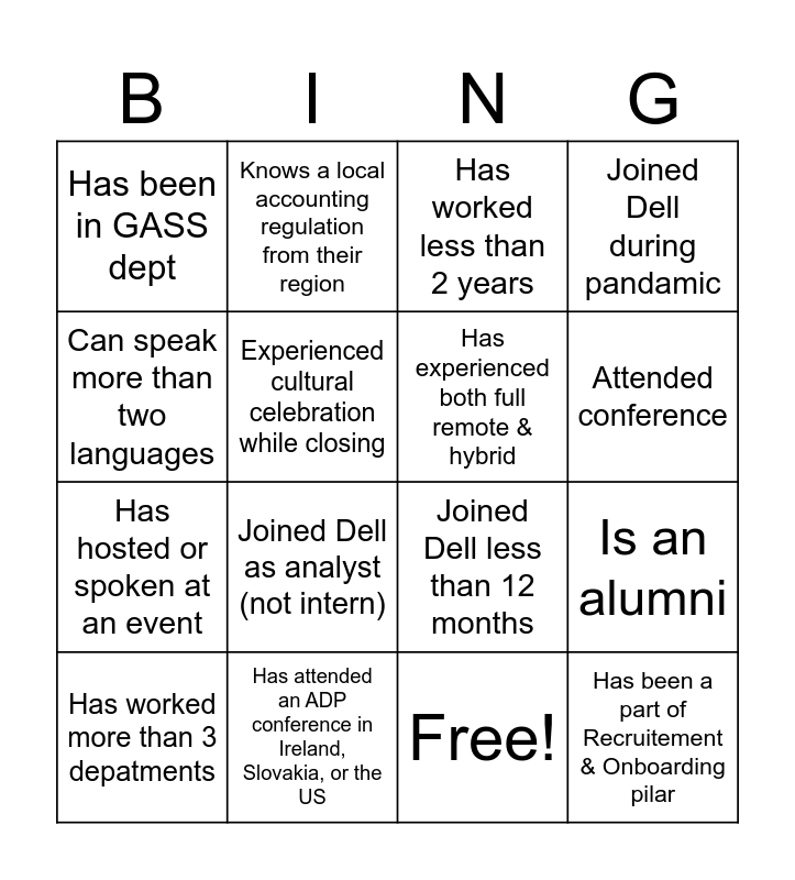 This bingo card has 17 words: Free!, Has worked more than 3 depatments, Has worked less than 2 years, Has been in GASS dept, Joined Dell as analyst (not intern), Joined Dell during pandamic, Is an alumni, Has experienced both full remote & hybrid, Attended conference, Experienced cultural celebration while closing, Has attended an ADP conference in Ireland, Slovakia, or the US, Joined Dell less than 12 months, Can speak more than two languages, Knows a local accounting regulation from their region, Has hosted or spoken at an event, Has been a part of Communication pilar and Has been a part of Recruitement & Onboarding pilar.