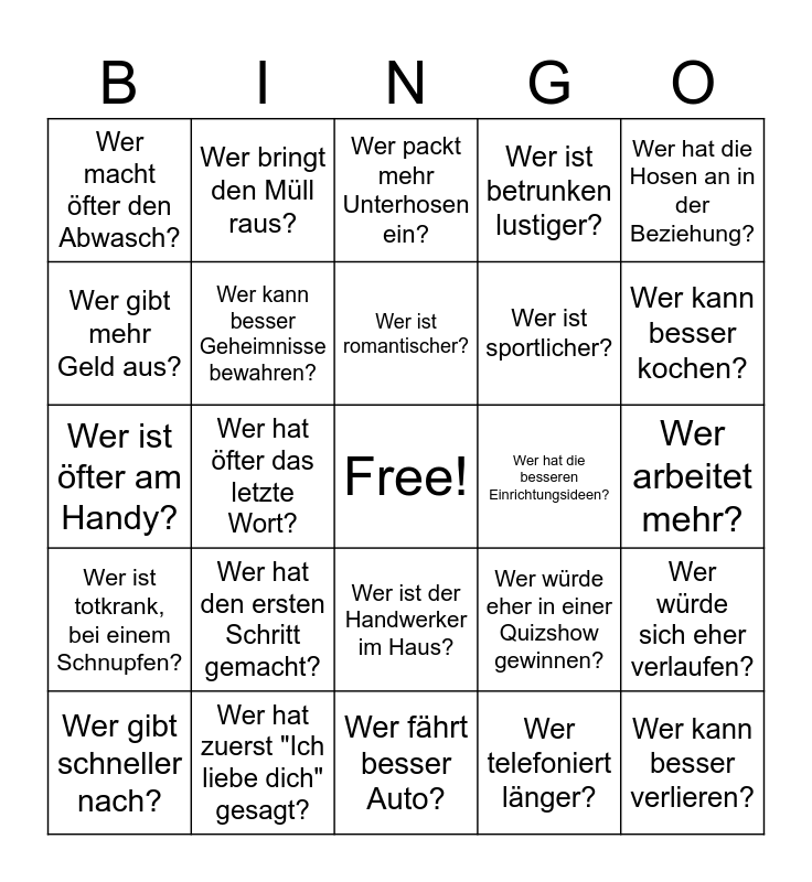 This bingo card has a free space and 24 words: Wer hat den ersten Schritt gemacht?, Wer hat zuerst "Ich liebe dich" gesagt?, Wer ist romantischer?, Wer gibt schneller nach?, Wer hat die Hosen an in der Beziehung?, Wer macht öfter den Abwasch?, Wer gibt mehr Geld aus?, Wer bringt den Müll raus?, Wer hat die besseren Einrichtungsideen?, Wer ist der Handwerker im Haus?, Wer ist sportlicher?, Wer ist öfter am Handy?, Wer würde eher in einer Quizshow gewinnen?, Wer würde sich eher verlaufen?, Wer kann besser Geheimnisse bewahren?, Wer telefoniert länger?, Wer arbeitet mehr?, Wer packt mehr Unterhosen ein?, Wer kann besser kochen?, Wer hat öfter das letzte Wort?, Wer kann besser verlieren?, Wer ist totkrank, bei einem Schnupfen?, Wer ist betrunken lustiger? and Wer fährt besser Auto?.