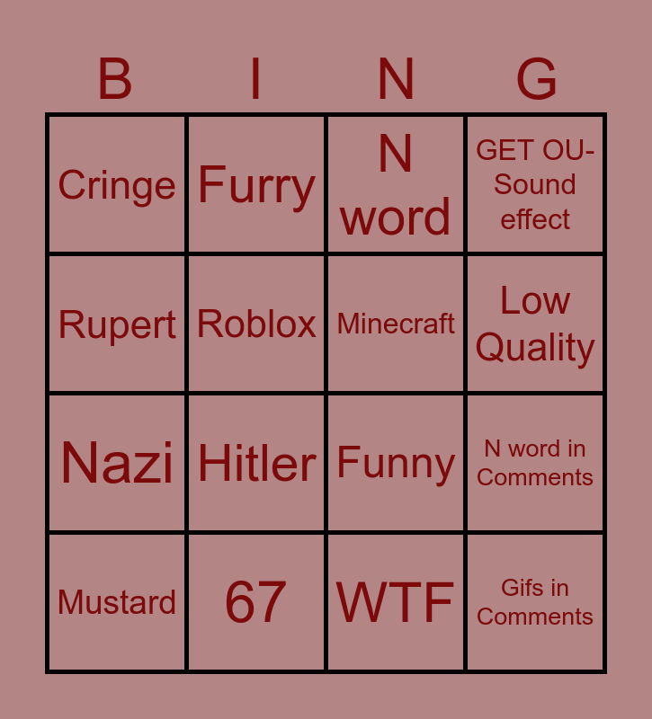 This bingo card has 19 words: Funny, Offensive, N word, Gifs in Comments, N word in Comments, Rupert, WTF, Cringe, Furry, Nazi, Hitler, Roblox, Minecraft, 67, Mustard, Brainrot, GET OU- Sound effect, Low Quality and Scream.