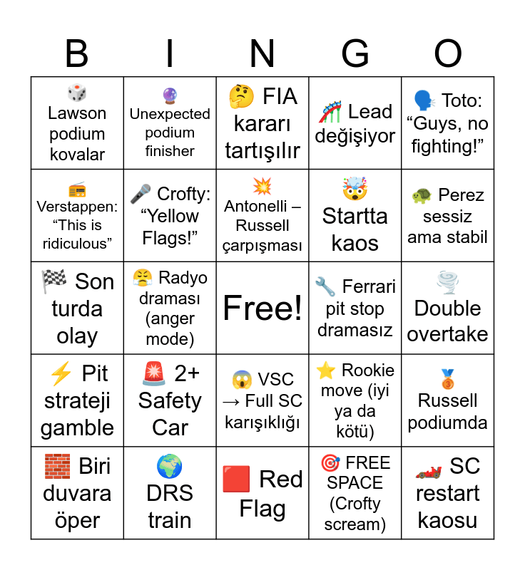 This bingo card has a free space and 25 words: 🚨 2+ Safety Car, 🟥 Red Flag, 💥 Antonelli – Russell çarpışması, 🧱 Biri duvara öper, 🗣️ Toto: “Guys, no fighting!”, 🎲 Lawson podium kovalar, 📻 Verstappen: “This is ridiculous”, 🔮 Unexpected podium finisher, 🔧 Ferrari pit stop dramasız, 😱 VSC → Full SC karışıklığı, 🤯 Startta kaos, 🏁 Son turda olay, ⭐ Rookie move (iyi ya da kötü), 🥉 Russell podiumda, 🎤 Crofty: “Yellow Flags!”, 🛠️ Mekanik DNF, 🌪️ Double overtake, 🤔 FIA kararı tartışılır, 🐢 Perez sessiz ama stabil, 😤 Radyo draması (anger mode), 🏎️ SC restart kaosu, 🌍 DRS train, ⚡ Pit strateji gamble, 🎢 Lead değişiyor and 🎯 FREE SPACE (Crofty scream).