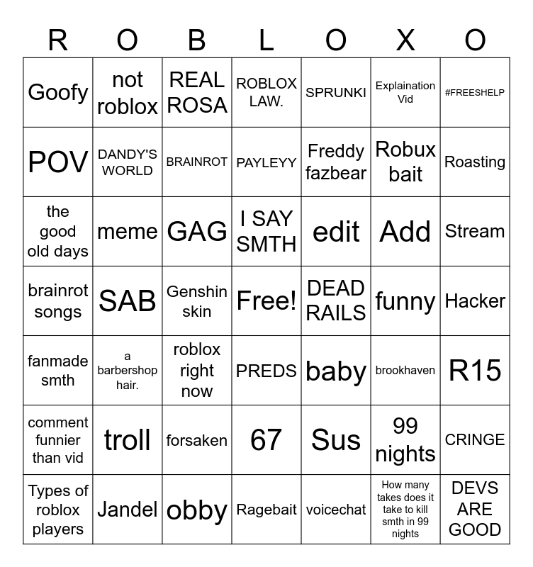 This bingo card has a free space and 48 words: Sus, Robux bait, Ragebait, SAB, GAG, Hacker, not roblox, Jandel, Explaination Vid, PREDS, #FREESHELP, ROBLOX LAW., Add, edit, comment funnier than vid, funny, POV, Roasting, 99 nights, SPRUNKI, Freddy fazbear, Genshin skin, Goofy, DANDY'S WORLD, CRINGE, BRAINROT, Stream, Types of roblox players, I SAY SMTH, meme, How many takes does it take to kill smth in 99 nights, DEAD RAILS, R15, troll, brainrot songs, baby, brookhaven, the good old days, roblox right now, forsaken, fanmade smth, DEVS ARE GOOD, REAL ROSA, obby, PAYLEYY, 67, a barbershop hair. and voicechat.