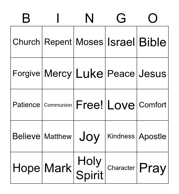 This bingo card has a free space and 24 words: Matthew, Mark, Luke, Hope, Bible, Church, Forgive, Repent, Love, Joy, Peace, Patience, Kindness, Apostle, Mercy, Character, Comfort, Moses, Jesus, Communion, Pray, Believe, Israel and Holy Spirit.