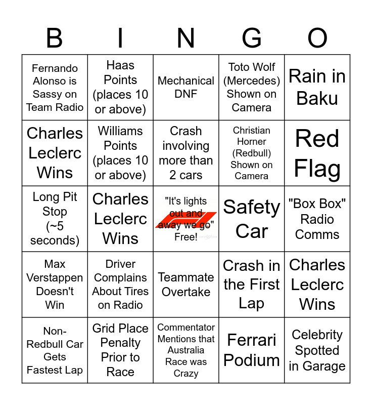 This bingo card has a free space and 34 words: Charles Leclerc Wins, Ferrari Podium, 5 Second Penalty Given, More than 1 Car Does Not Finish (DNF), Max Verstappen Doesn't Win, Williams Points (places 10 or above), Rain in Baku, Non-Redbull Car Gets Fastest Lap, Haas Points (places 10 or above), Someone Hits the Barriers, Crash involving more than 2 cars, Mechanical DNF, Swearing on Team Radio, 2 Drivers from Same Team on Podium, Safety Car, Red Flag, Grid Place Penalty Prior to Race, Long Pit Stop (~5 seconds), Driver Complains About Tires on Radio, Crash in the First Lap, Teammate Overtake, Blue Flags (car gets lapped), Fernando Alonso is Sassy on Team Radio, "Box Box" Radio Comms, Commentator Mentions that Australia Race was Crazy, Celebrity Spotted in Garage, Toto Wolf (Mercedes) Shown on Camera, F1 Driver Not Currently on the Grid Currently Mentioned / Shown, Christian Horner (Redbull) Shown on Camera, Charles Leclerc Wins, Charles Leclerc Wins, Charles Leclerc Wins, Charles Leclerc Wins and Charles Leclerc Wins.