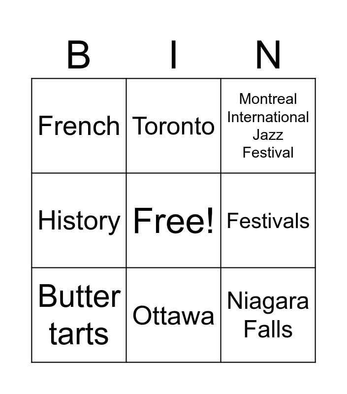 This bingo card has a free space and 30 words: Canada, France, Britain, English, French, Montreal International Jazz Festival, Butter tarts, Poutine, Maple syrup, Tourtière, Winterlude, July 1st, Finn Wolfhard, Avril Lavigne, Shawn Mendes, Brokeback Mountain, Deadpool, The Umbrella Academy, Chilling adventures of Sabrina, Niagara Falls, Parliament Hill, CN Tower, Toronto, Indigenous, Festivals, History, Cuisine, Statue of Terry Fox, Ottawa and Vancouver.