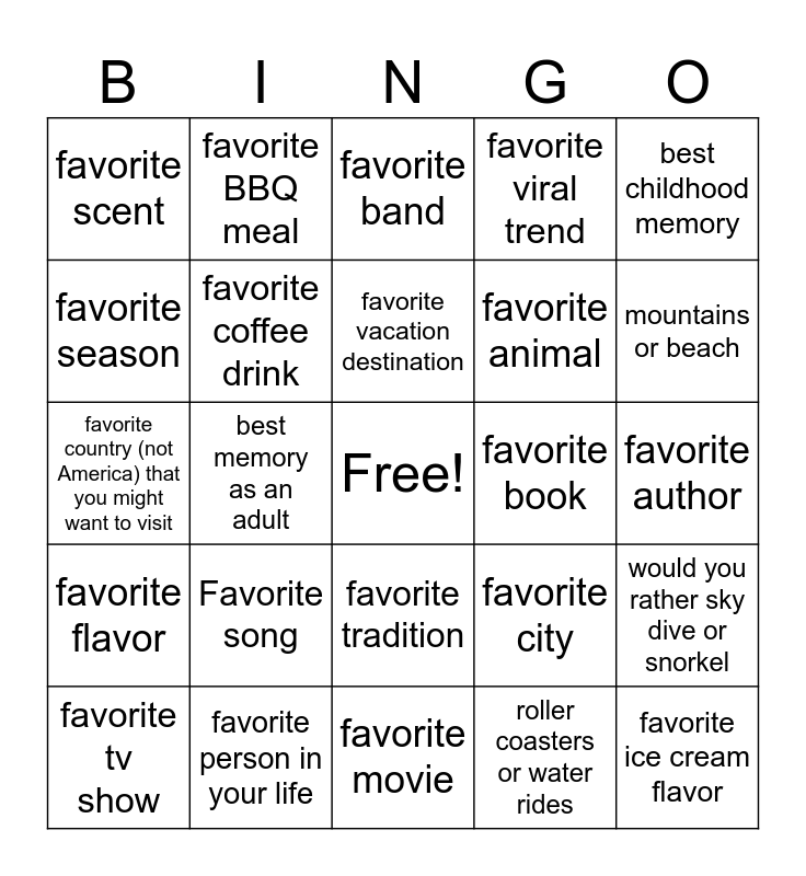 This bingo card has a free space and 24 words: Favorite song, favorite person in your life, favorite vacation destination, favorite tv show, best childhood memory, favorite scent, favorite season, favorite BBQ meal, favorite book, favorite tradition, favorite animal, favorite country (not America) that you might want to visit, favorite city, would you rather sky dive or snorkel, favorite coffee drink, roller coasters or water rides, favorite author, favorite band, mountains or beach, best memory as an adult, favorite ice cream flavor, favorite flavor, favorite viral trend and favorite movie.