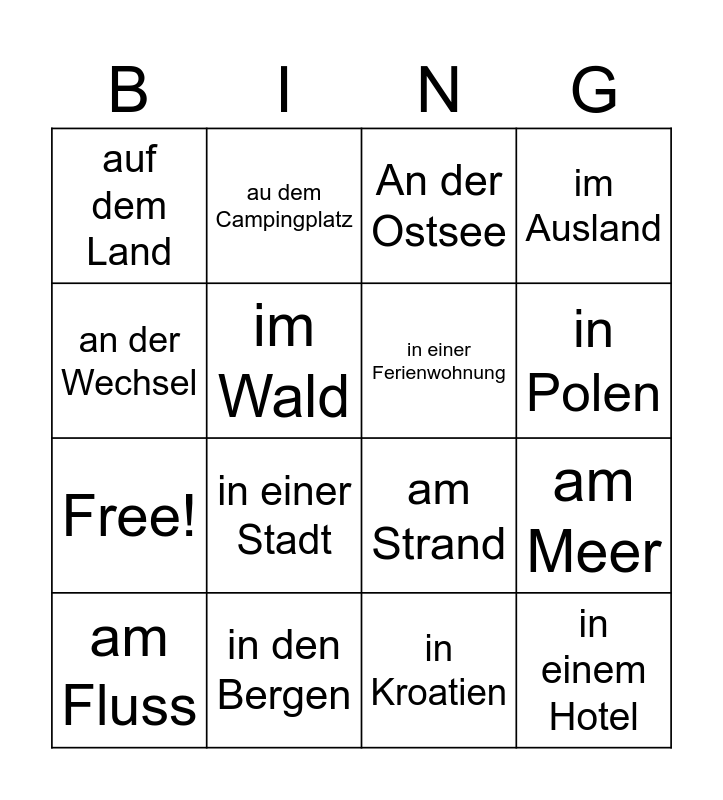 This bingo card has 20 words: am Meer, im Gebirge, An der Ostsee, zu Hause, am Fluss, an der Wechsel, in den Bergen, auf dem Land, Free!, au dem Campingplatz, in einer Stadt, am Strand, im Wald, in einem Hotel, in einer Ferienwohnung, in der Türkei, in Polen, im Ausland, in Kroatien and in den USA.