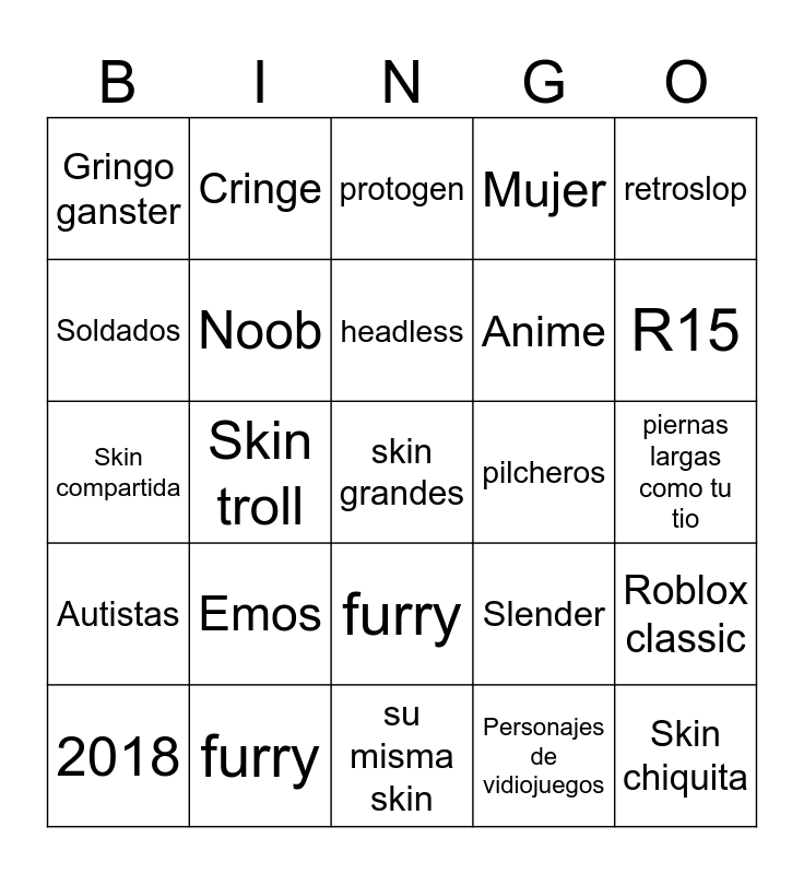 This bingo card has a free space and 24 words: Emos, furry, headless, 2018, retroslop, Gringo ganster, Soldados, Cringe, pilcheros, furry, Anime, Skin compartida, Slender, Roblox classic, Noob, Personajes de vidiojuegos, piernas largas como tu tio, protogen, R15, Skin troll, Skin chiquita, Autistas, Mujer and su misma skin.