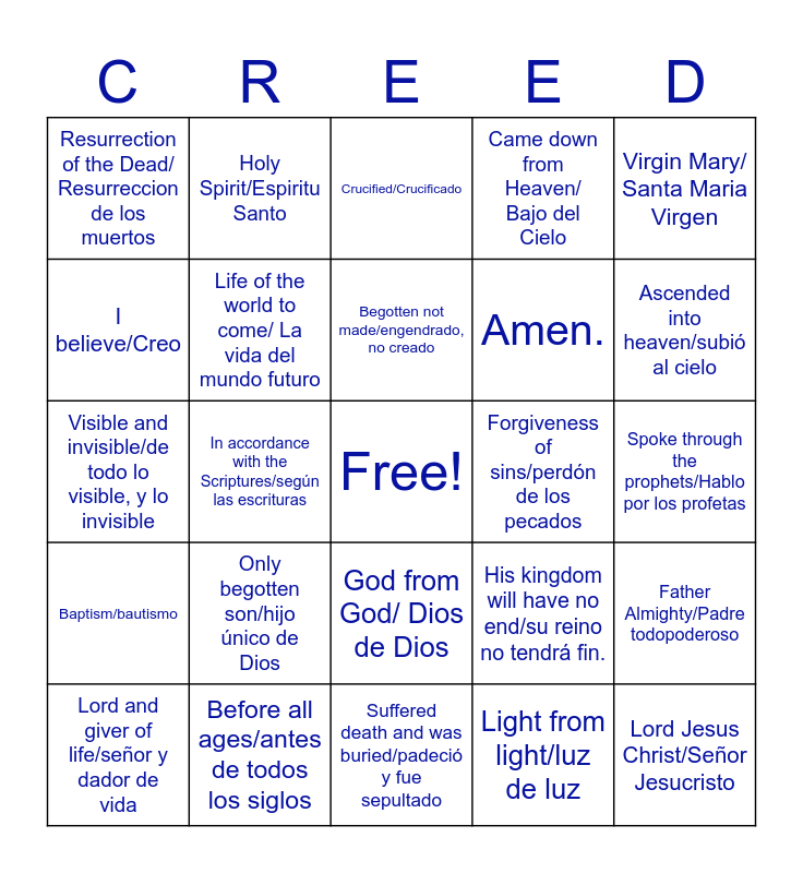 This bingo card has a free space and 29 words: Born of the Father/Nacido del Padre, Before all ages/antes de todos los siglos, Crucified/Crucificado, One, Holy, Catholic, and Apostolic/Una, Santa, Catolica, y Apostolica, Virgin Mary/ Santa Maria Virgen, Resurrection of the Dead/ Resurreccion de los muertos, Life of the world to come/ La vida del mundo futuro, Begotten not made/engendrado, no creado, Forgiveness of sins/perdón de los pecados, Father Almighty/Padre todopoderoso, Lord and giver of life/señor y dador de vida, In accordance with the Scriptures/según las escrituras, Light from light/luz de luz, Lord Jesus Christ/Señor Jesucristo, Visible and invisible/de todo lo visible, y lo invisible, Pontius Pilate/Poncio Pilato, Suffered death and was buried/padeció y fue sepultado, His kingdom will have no end/su reino no tendrá fin., Ascended into heaven/subió al cielo, Baptism/bautismo, Only begotten son/hijo único de Dios, Maker of Heaven and Earth/creador del cielo y de la tierra, Amen., Spoke through the prophets/Hablo por los profetas, I believe/Creo, Holy Spirit/Espiritu Santo, God from God/ Dios de Dios, Came down from Heaven/ Bajo del Cielo and judge the living and the dead/ juzgar a los vivos y muertos.