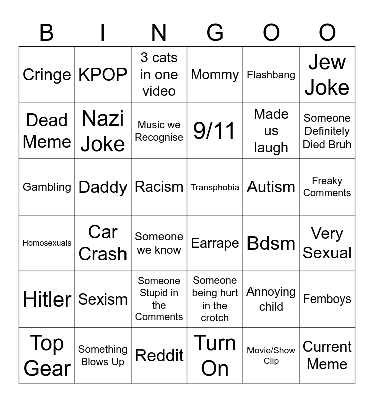 This bingo card has 44 words: Free!, Gambling, Alcoholism, Someone we know, Someone being hurt in the crotch, Very Sexual, 3 cats in one video, Minecraft, Flashbang, Earrape, Mommy, Daddy, Freaky Comments, Autism, Reddit, Bdsm, Femboys, Made us laugh, FNAF, 9/11, KPOP, Top Gear, Annoying child, Cringe, Tiktok reupload, Racism, Sexism, N Word, Homosexuals, Transphobia, Gayphobia, Car Crash, Something Blows Up, Turn On, Someone Definitely Died Bruh, Someone Stupid in the Comments, Movie/Show Clip, Hitler, Nazi Joke, Jew Joke, Music we Recognise, Current Meme, Dead Meme and Obesity.
