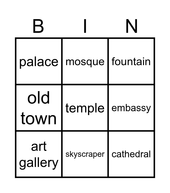This bingo card has a free space and 8 words: embassy, fountain, mosque, art gallery, palace, cathedral, old town and skyscraper.