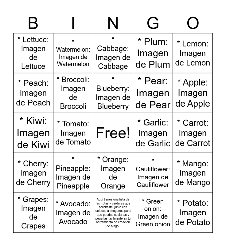 This bingo card has a free space and 31 words: Aquí tienes una lista de las frutas y verduras que solicitaste, junto con enlaces a imágenes para que puedas copiarlas y pegarlas fácilmente en tu herramienta de creación de bingo., * Corn: Imagen de Corn, * Tomato: Imagen de Tomato, * Onion: Imagen de Onion, * Lettuce: Imagen de Lettuce, * Cabbage: Imagen de Cabbage, * Broccoli: Imagen de Broccoli, * Cauliflower: Imagen de Cauliflower, * Garlic: Imagen de Garlic, * Green onion: Imagen de Green onion, * Carrot: Imagen de Carrot, * Potato: Imagen de Potato, * Bell pepper: Imagen de Bell pepper, * Cucumber: Imagen de Cucumber, * Apple: Imagen de Apple, * Strawberry: Imagen de Strawberry, * Mango: Imagen de Mango, * Pineapple: Imagen de Pineapple, * Cherry: Imagen de Cherry, * Orange: Imagen de Orange, * Lemon: Imagen de Lemon, * Banana: Imagen de Banana, * Grapes: Imagen de Grapes, * Watermelon: Imagen de Watermelon, * Pear: Imagen de Pear, * Peach: Imagen de Peach, * Plum: Imagen de Plum, * Kiwi: Imagen de Kiwi, * Avocado: Imagen de Avocado, * Blueberry: Imagen de Blueberry and * Raspberry: Imagen de.