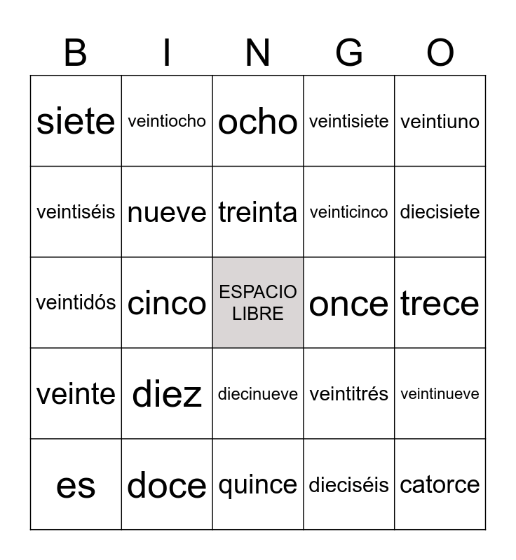 This bingo card has a free space and 29 words: es, cuatro, cinco, seis, siete, ocho, nueve, diez, once, doce, trece, catorce, quince, dieciséis, diecisiete, dieciocho, diecinueve, veinte, veintiuno, veintidós, veintitrés, veinticuatro, veinticinco, veintiséis, veintisiete, veintiocho, veintinueve, treinta and treinta y uno.