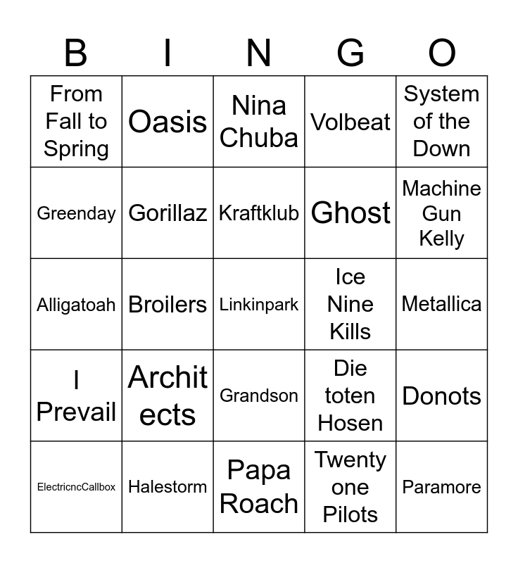 This bingo card has a free space and 24 words: Archit ects, Halestorm, Kraftklub, ElectricncCallbox, System of the Down, From Fall to Spring, Greenday, Oasis, Ice Nine Kills, Grandson, Ghost, Alligatoah, Die toten Hosen, Donots, Gorillaz, Twenty one Pilots, Metallica, Nina Chuba, Machine Gun Kelly, Broilers, Paramore, I Prevail, Volbeat and Papa Roach.