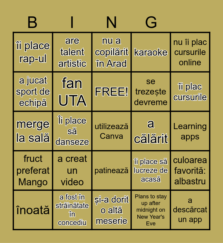 This bingo card has 60 words: are cel puțin doi copii, a fost în străinătate în concediu, citește mult, a călărit, s-a născut toamna, mănâncă multe legume, fan UTA, joacă baschet, karaoke, are animale de casă, a jucat sport de echipă, are un hobby interesant, FREE!, are frați mai în vârstă, a mâncat ceva exotic, îi place rap-ul, Îi place să danseze, nu a copilărit în Arad, vorbește alte limbi, îi plac cursurile, merge la sală, are talent artistic, și-a dorit o altă meserie, îi place să lucreze de acasă, îi plac jocurile de societate, tik tok, domino, tatuaj, se trezește devreme, insta, a prins un pește, joc de cărți, taco, a fost la peste 2000 m, nu îi plac cursurile online, înoată, Geogebra, utilizează Canva, a postat pe youtube, Learning apps, jocuri de noroc, a creat un video, patinează, pescuiește regulat, a descărcat un app, a lucrat și în alt domeniu, gătește, face prăjituri, a stat în cămin, culoarea favorită: albastru, fruct preferat Mango, un serial lung, merge la munte, face curățenie foarte des, Is eating tamales for Xmas, Has gone paint balling, Has chickens at home, is celebrating Kwanza this year, Plans to stay up after midnight on New Year's Eve and Loves Science!.