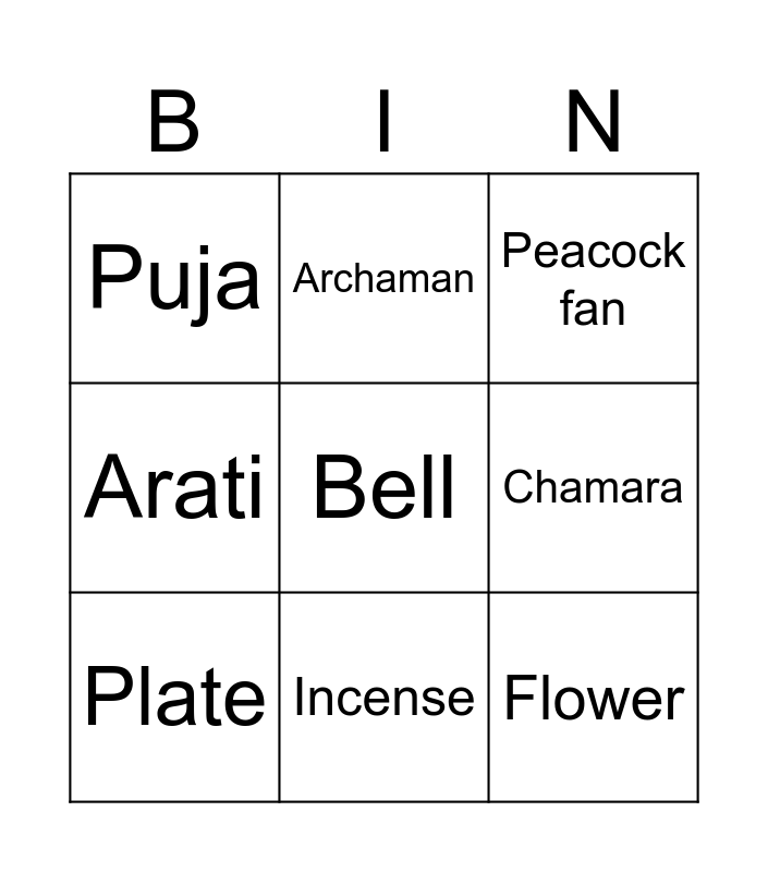 This bingo card has a free space and 11 words: Conch, Incense, Flower, Plate, Archaman, Peacock fan, Chamara, Handkerchief, Arati, Puja and Darshan.