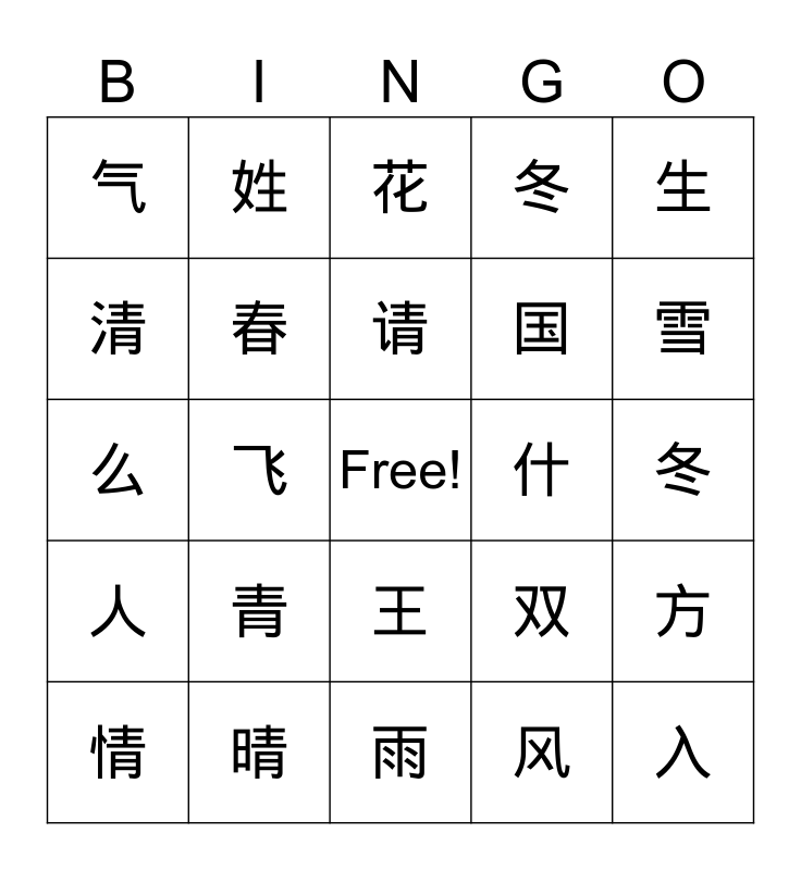 This bingo card has a free space and 24 words: 青, 晴, 请, 情, 生, 气, 清, 姓, 什, 王, 国, 么, 双, 方, 春, 风, 冬, 花, 雪, 飞, 入, 人, 冬 and 雨.