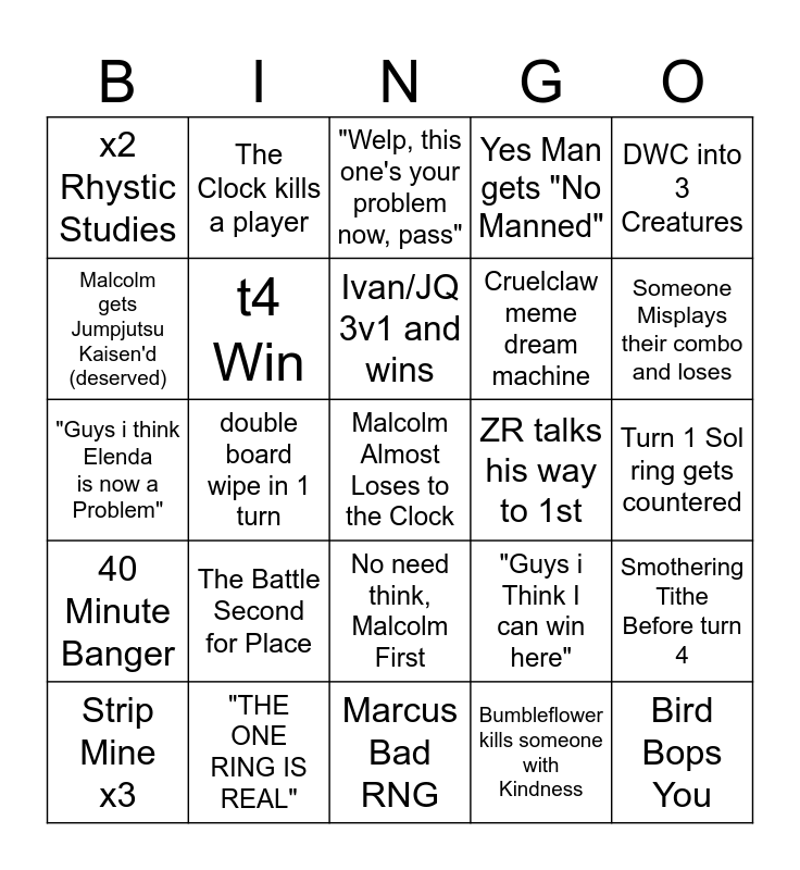 This bingo card has a free space and 39 words: Jeffrey takes 5min Turn, x2 Smothering Tithe, The Old man still got it, t4 Win, Strip Mine x3, No need think, Malcolm First, Ivan/JQ 3v1 and wins, Jq & Ivan Handshake, DWC into 3 Creatures, 40 Minute Banger, double board wipe in 1 turn, Yes Man gets "No Manned", Bird Bops You, Turn 1 Sol ring gets countered, ZR talks his way to 1st, The Battle Second for Place, "You are the Jeffrey to my ZR", x2 Rhystic Studies, Ivan dies to RNG, "Guys i Think I can win here", Malcolm gets Jumpjutsu Kaisen'd (deserved), Marcus Bad RNG, Cruelclaw meme dream machine, Someone Misplays their combo and loses, "we dont negotiate with terrorist", Triple Terrorist Pod, "Who's a good boy?" (magebane is), Nametaker strikes again!, "im gonna do a malcolm play", The Clock kills a player, Commander tax x4, Someone Jumps Priority, "Welp, this one's your problem now, pass", "THE ONE RING IS REAL", Bumbleflower kills someone with Kindness, Wheelchair Teysa Wins, Smothering Tithe Before turn 4, "Guys i think Elenda is now a Problem" and Oppo into Fetch land.