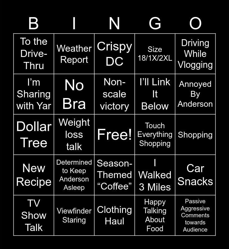 This bingo card has a free space and 69 words: Fake Affection towards Anderson, Shopping, Nasty Nancy Appearance, Filter Fail, Viewfinder Staring, Low / 0 WW Points, Size 18/1X/2XL, Returning Items, Driving While Vlogging, Yar Appearance, Car Snacks, Drinks Alani, To the Drive-Thru, Crispy DC, Manic Ranting, Weight loss talk, Season-Themed “Coffee”, I’ll Link It Below, Anderson Napping, New Recipe, Touch Everything Shopping, I Walked 3 Miles, Annoyed By Anderson, Eats on Camera, This Is Yar’s Plate, Anderson wearing only sleepers & no footwear, Pregnancy Talk, Theatre Kid, Happy Talking About Food, Promising “Different” Content, Weather Report, Breathless Just Talking, Ruins a Recipe, Sweating Doing Everyday Things, Pretends to Have Friends, Anxious about Vlogging In Public, Oversized, No Vegetables Consumed, I’m Sharing with Yar, GRWM, Determined to Keep Anderson Asleep, Passive Aggressive Comments towards Audience, Copies Other Influencers, No Walk For Bruno, Latest SM Trend, TV Show Talk, Yar replaced w/ Nancy for Family Outings, Doesn’t accurately measure ingredients, Greasy Hair, No Bra, Non-scale victory, Tiny plate portions, Bruno left in car, Clothing Haul, Smacking on food, Constantly complaining of being hot, Grocery Haul, Monster talk at Anderson, Films Anderson for No Reason, Dollar Tree, Walmart, Home Goods, “Dupe” Items, Time filler footage, cozy, repeating the same content, watch activity is active, target and odd social interactions.