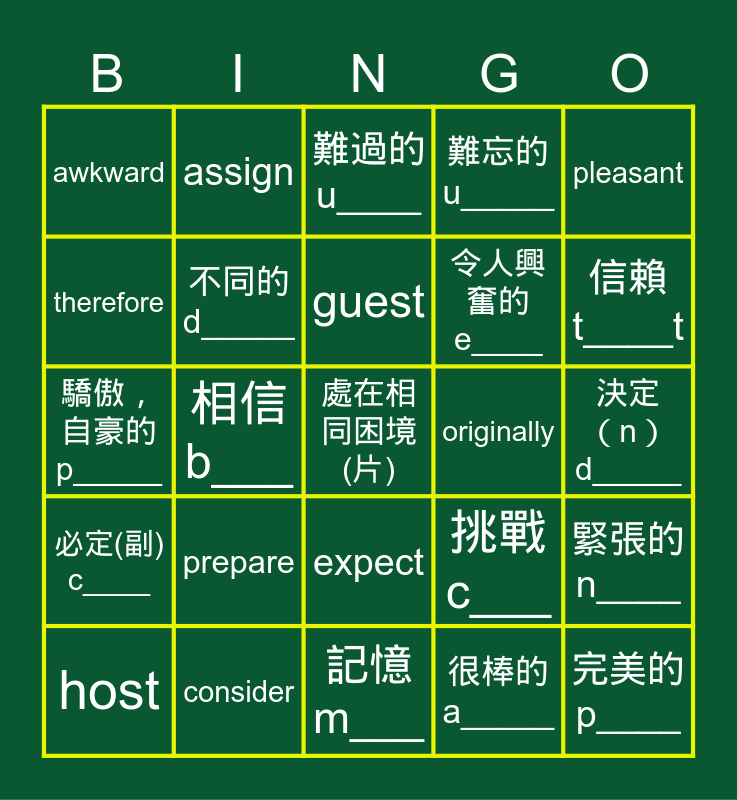 This bingo card has a free space and 24 words: prepare, consider, guest, host, pleasant, awkward, therefore, assign, originally, expect, 令人興奮的 e____, 驕傲,自豪的 p_____, 挑戰 c___, 緊張的n____, 不同的 d_____, 很棒的 a_____, 決定(n)d_____, 難過的 u____, 信賴 t____t, 相信b___, 完美的 p____, 必定(副) c____, 難忘的 u_____ and 記憶 m___.