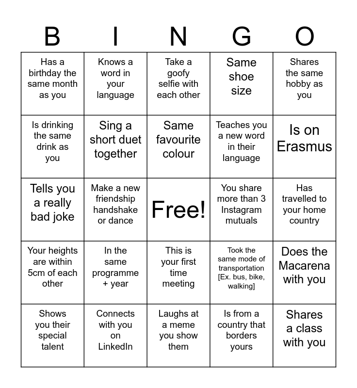 This bingo card has a free space and 24 words: In the same programme + year, Connects with you on LinkedIn, Same favourite colour, Shows you their special talent, Shares the same hobby as you, Has a birthday the same month as you, Is drinking the same drink as you, Knows a word in your language, You share more than 3 Instagram mutuals, This is your first time meeting, Teaches you a new word in their language, Tells you a really bad joke, Took the same mode of transportation [Ex. bus, bike, walking], Does the Macarena with you, Sing a short duet together, Is from a country that borders yours, Has travelled to your home country, Take a goofy selfie with each other, Is on Erasmus, Make a new friendship handshake or dance, Shares a class with you, Your heights are within 5cm of each other, Same shoe size and Laughs at a meme you show them.