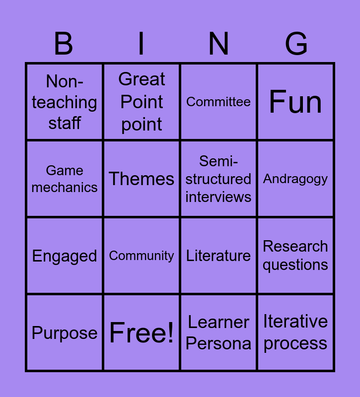 This bingo card has 25 words: FERPA, Gamification, Andragogy, Adult learning theory, Game mechanics, Non-teaching staff, Themes, Great Point point, Free!, Social constructivism, Engaged, Literature, Codes, Surveys, Semi-structured interviews, Observation, Learner Persona, Committee, Community, Research questions, Purpose, Data collection, Iterative process, Fun and Retention.