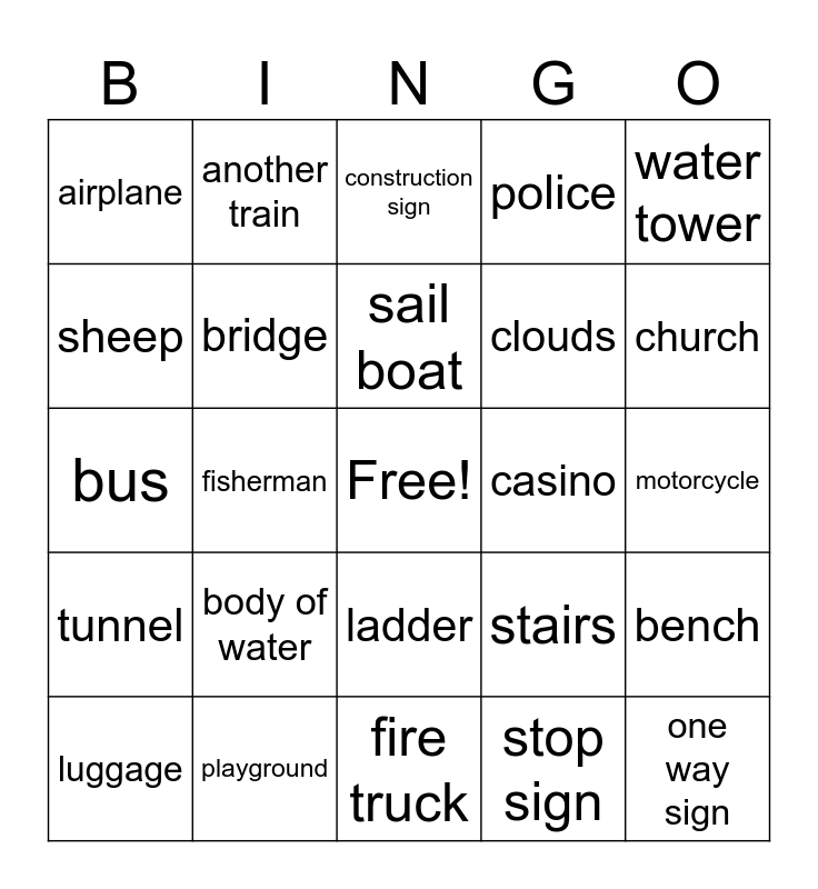 This bingo card has a free space and 34 words: traffic light, stop sign, bird, cow, tunnel, bridge, water tower, luggage, another train, red flowers, sail boat, construction sign, cemetery, light house, casino, church, playground, bus, body of water, stairs, ladder, barn, airplane, motorcycle, fire truck, one way sign, police, American flag, clouds, sheep, horse, fisherman, bench and dog.