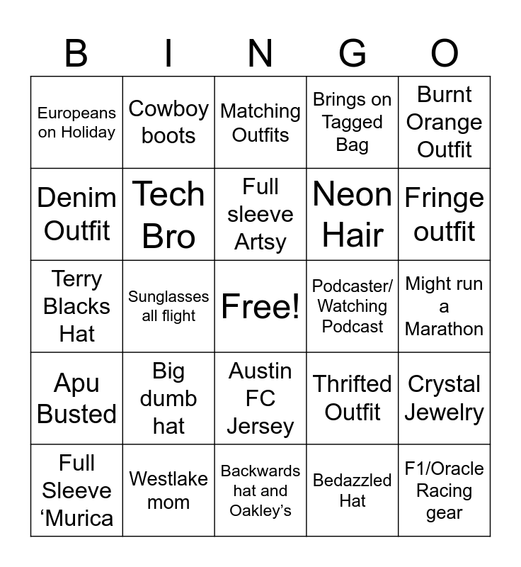 This bingo card has a free space and 24 words: Big dumb hat, Westlake mom, Full sleeve Artsy, Full Sleeve ‘Murica, Burnt Orange Outfit, Europeans on Holiday, Denim Outfit, Cowboy boots, Podcaster/ Watching Podcast, Austin FC Jersey, Neon Hair, Terry Blacks Hat, Thrifted Outfit, Crystal Jewelry, Tech Bro, Bedazzled Hat, Might run a Marathon, Matching Outfits, Fringe outfit, Sunglasses all flight, F1/Oracle Racing gear, Apu Busted, Brings on Tagged Bag and Backwards hat and Oakley’s.