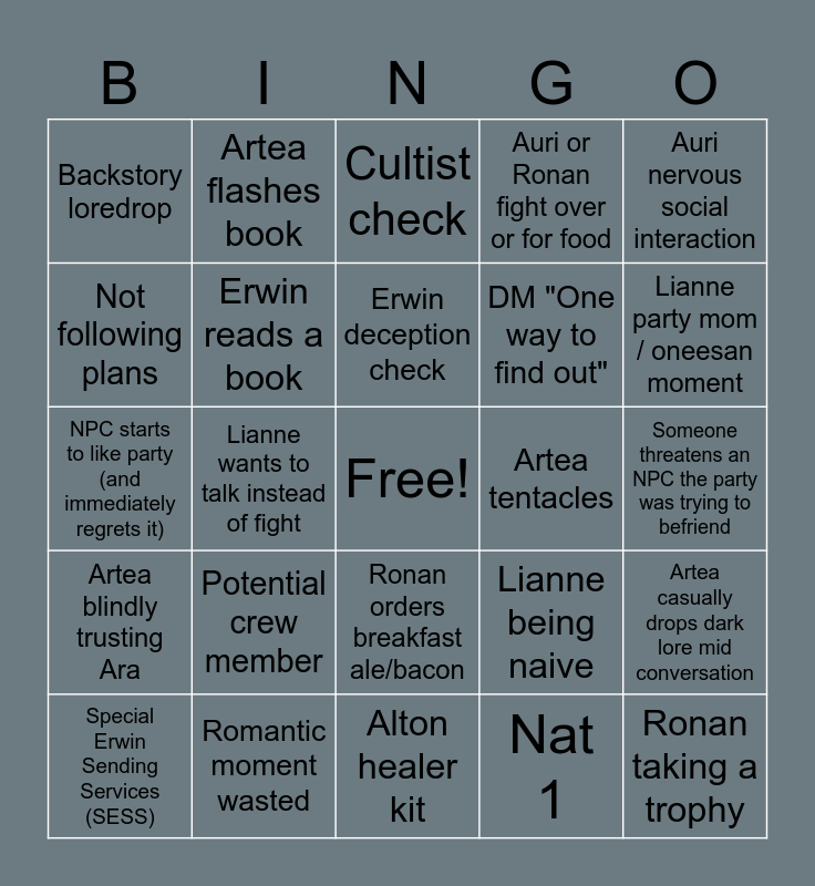 This bingo card has a free space and 55 words: Ronan almost starts a fight, Special Erwin Sending Services (SESS), Cat joke about Artea, Backstory loredrop, Alton healer kit, Ronan gets scolded, Erwin reads a book, Artea finds a use for paper, DM "One way to find out", Alton 25+ sleight of hand, Auri or Ronan fight over or for food, Auri makes a mean comment, Raiko giggling at innuendo / pun, Roll for initiative, Alton shady joke, Deploying animals out of combat, Auri nervous social interaction, Lianne wants to talk instead of fight, Party name drop, Ronan taking a trophy, Artea tentacles, Name spelled wrong, Lianne being naive, Cultist check, Worldbuilding loredrop, Erwin deception check, Nat 1, Nat 20, Someone threatens an NPC the party was trying to befriend, Artea casually drops dark lore mid conversation, Party got split, Plan goes wrong, Going in with no plan, Auri causes chaos while Wildshaped, Not following plans, NPC starts to like party (and immediately regrets it), Auri speaks with animals (and argues with them), Artea blindly trusting Ara, Lianne being our moral compass, Alton meets a horse, Artea flashes book, Crazy dice RNG, Ronan doesn't trust an NPC, Door boss, Potential crew member, Romantic moment wasted, DM "You can certainly try", Someone added cool flavor to 'I attack/cast', "oh no they're hot", Lianne party mom / oneesan moment, Someone suggesting crime, Someone from the party gets really drunk, Below 10 on a save you're (supposed to be) good at, Ronan orders breakfast ale/bacon and Big misunder-standing.