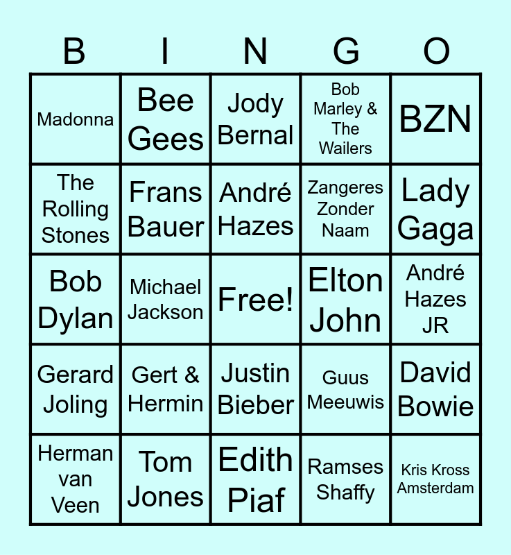 This bingo card has a free space and 50 words: Golden Earing, Kris Kross Amsterdam, Abba, Edith Piaf, Gert & Hermin, Elvis Presley, Bee Gees, Doe Maar, The Rolling Stones, The Cats, Frans Bauer, Bob Marley & The Wailers, David Bowie, Guus Meeuwis, Ike & Tina Turn, Queen, André Hazes, Elton John, Donna Summer, BZN, Michael Jackson, Ramses Shaffy, Madonna, Zangeres Zonder Naam, Maurice Ravel (London Symphony), Willeke Alberti, Lady Gaga, Anouk, Jody Bernal, Justin Bieber, Mart Hoogkamer, Dolly Parton, Dolly Dots, Meat Loaf, Tom Jones, Bonnie St Claire, Louis Armstrong, Sting, Neil Diamond, André Hazes JR, Bee Gees, Armin van Buuren, Mariah Carey, Robbie Williams, Herman van Veen, Bob Dylan, Claude, Adele, Gerard Joling and André van Duin.