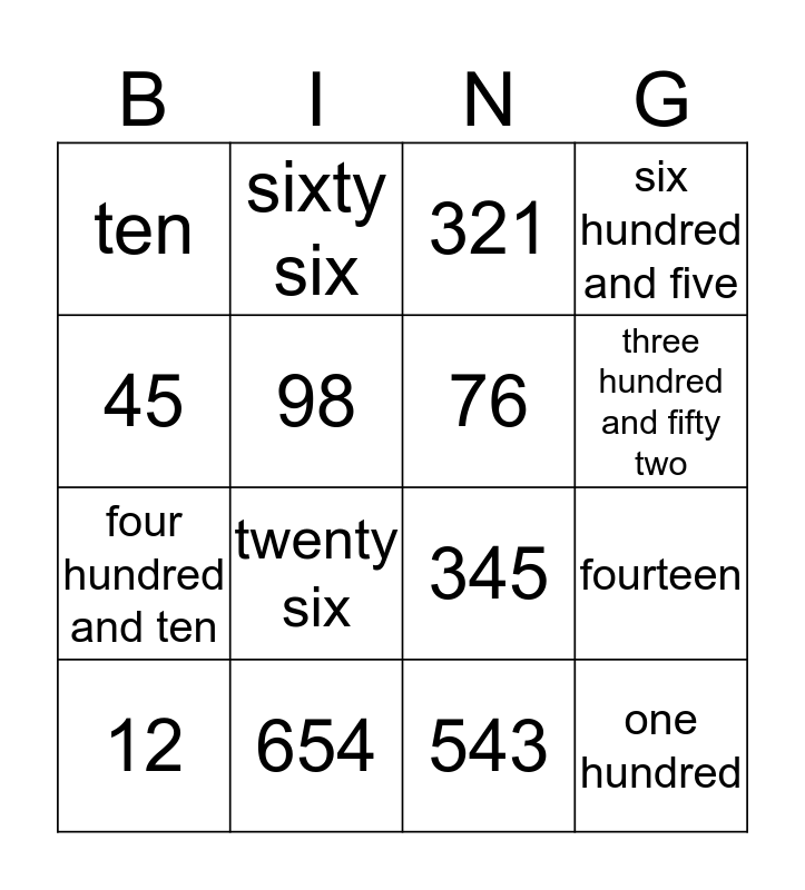 This bingo card has a free space and 15 words: 12, one hundred, 321, ten, three hundred and fifty two, 45, twenty six, 543, 98, four hundred and ten, fourteen, six hundred and five, 76, sixty six and 654.
