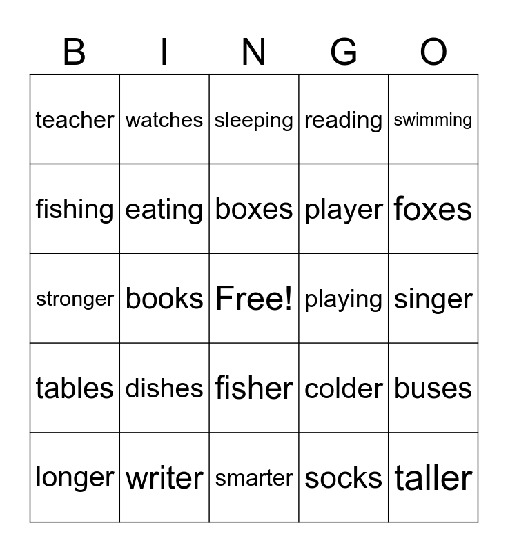 This bingo card has a free space and 24 words: dishes, writer, boxes, longer, swimming, teacher, fishing, watches, playing, fisher, player, stronger, colder, buses, eating, socks, singer, sleeping, foxes, books, taller, tables, reading and smarter.