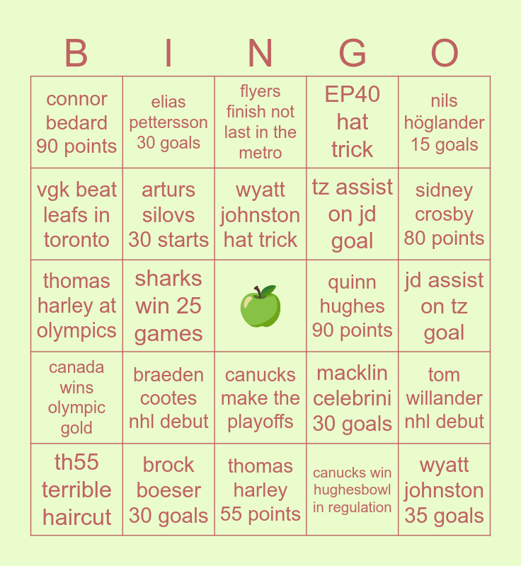 This bingo card has a free space and 24 words: braeden cootes nhl debut, brock boeser 30 goals, wyatt johnston hat trick, th55 terrible haircut, nils höglander 15 goals, connor bedard 90 points, vgk beat leafs in toronto, elias pettersson 30 goals, quinn hughes 90 points, canucks make the playoffs, tz assist on jd goal, thomas harley at olympics, macklin celebrini 30 goals, tom willander nhl debut, arturs silovs 30 starts, canucks win hughesbowl in regulation, jd assist on tz goal, flyers finish not last in the metro, sidney crosby 80 points, sharks win 25 games, wyatt johnston 35 goals, canada wins olympic gold, EP40 hat trick and thomas harley 55 points.