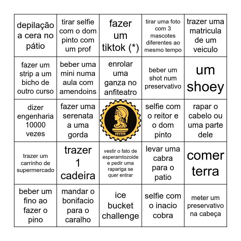 This bingo card has a free space and 29 words: beber um fino ao fazer o pino, abençoar uma trajada com o dom pinto, ice bucket challenge, selfie com o inacio cobra, trazer uma matricula de um veiculo, fazer um strip a um bicho de outro curso, tirar selfie com o dom pinto com um prof, trazer um sinal de transito, selfie com o reitor e o dom pinto, meter um preservativo na cabeça, dizer engenharia 10000 vezes, beber uma mini numa aula com amendoins, fazer um tubarao com uma poncha, levar uma cabra para o patio, rapar o cabelo ou uma parte dele, fazer uma poncha durante a praxe, fazer uma serenata a uma gorda, vestir o fato de esperamtozoide e pedir uma rapariga se quer entrar, tirar uma foto com 3 mascotes diferentes ao mesmo tempo, comer terra, trazer um carrinho de supermercado, mandar o bonifacio para o caralho, enrolar uma ganza no anfiteatro, beber um shot num preservativo, um shoey, depilação a cera no pátio, trazer 1 cadeira, fazer um tiktok (*) and tirar uma foto com o PH.
