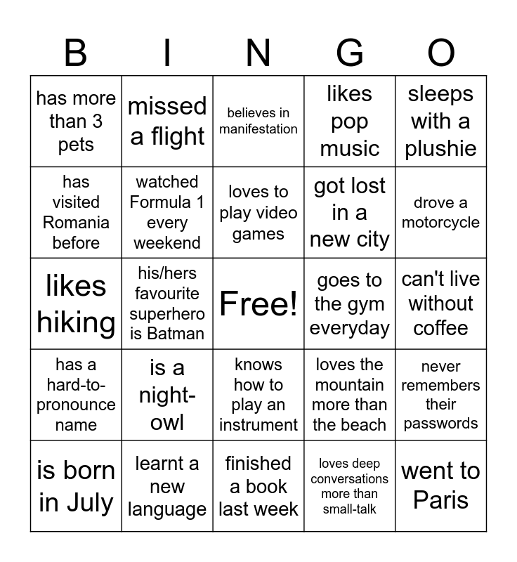 This bingo card has a free space and 24 words: is born in July, is a night-owl, loves to play video games, loves deep conversations more than small-talk, sleeps with a plushie, has more than 3 pets, missed a flight, believes in manifestation, goes to the gym everyday, can't live without coffee, likes hiking, watched Formula 1 every weekend, loves the mountain more than the beach, never remembers their passwords, has visited Romania before, learnt a new language, finished a book last week, likes pop music, drove a motorcycle, has a hard-to-pronounce name, his/hers favourite superhero is Batman, knows how to play an instrument, got lost in a new city and went to Paris.