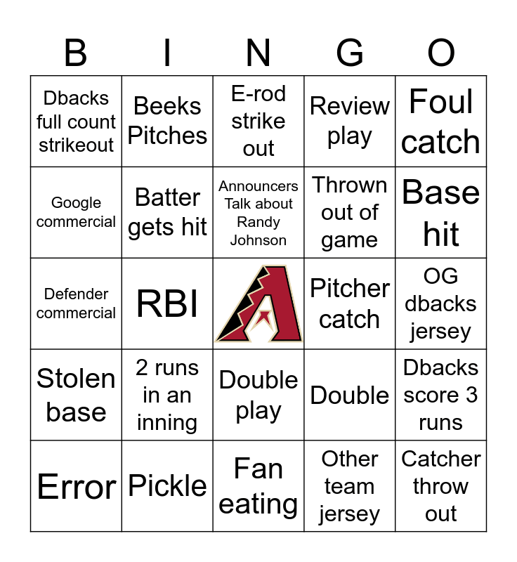 This bingo card has a free space and 29 words: Home run, Pickle, E-rod strike out, Sliding catch, Foul catch, Dbacks full count strikeout, Batter gets hit, Announcers Talk about Randy Johnson, Pitcher catch, Dbacks score 3 runs, Error, RBI, Other team jersey, Catcher throw out, Defender commercial, Foul catch by fan, Fan eating, Double, Base hit, Stolen base, 2 runs in an inning, Walk, Thrown out of game, OG dbacks jersey, Google commercial, Beeks Pitches, Double play, Review play and Rob home run.