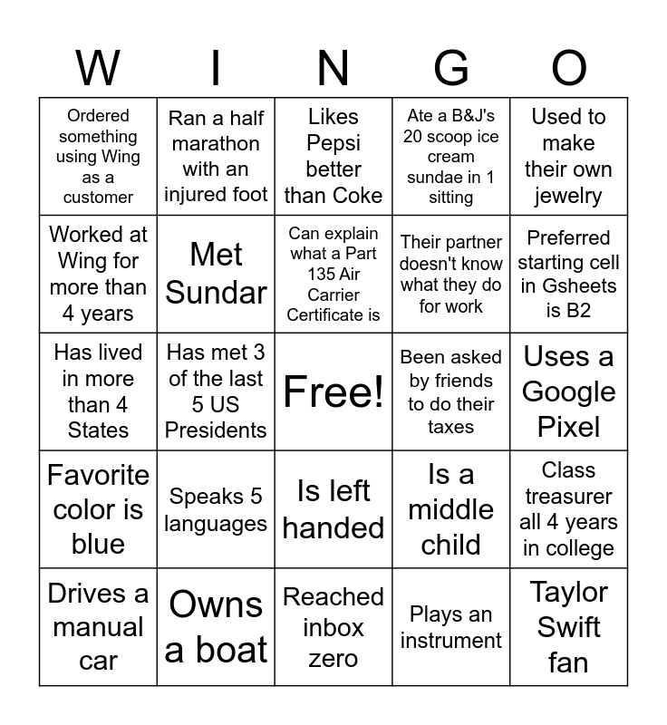 This bingo card has a free space and 24 words: Speaks 5 languages, Owns a boat, Can explain what a Part 135 Air Carrier Certificate is, Drives a manual car, Used to make their own jewelry, Ordered something using Wing as a customer, Worked at Wing for more than 4 years, Ran a half marathon with an injured foot, Been asked by friends to do their taxes, Is left handed, Their partner doesn't know what they do for work, Has lived in more than 4 States, Is a middle child, Class treasurer all 4 years in college, Met Sundar, Plays an instrument, Uses a Google Pixel, Likes Pepsi better than Coke, Preferred starting cell in Gsheets is B2, Has met 3 of the last 5 US Presidents, Taylor Swift fan, Favorite color is blue, Ate a B&J's 20 scoop ice cream sundae in 1 sitting and Reached inbox zero.