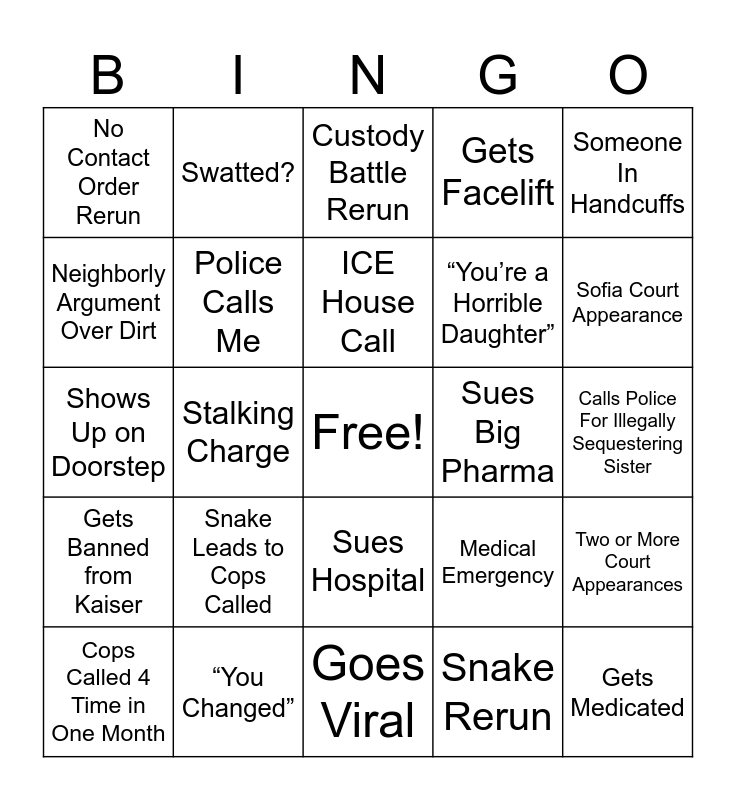 This bingo card has a free space and 24 words: Snake Leads to Cops Called, “You Changed”, ICE House Call, Cops Called 4 Time in One Month, Someone In Handcuffs, No Contact Order Rerun, Neighborly Argument Over Dirt, Swatted?, Sues Big Pharma, Sues Hospital, “You’re a Horrible Daughter”, Shows Up on Doorstep, Medical Emergency, Two or More Court Appearances, Police Calls Me, Snake Rerun, Calls Police For Illegally Sequestering Sister, Custody Battle Rerun, Sofia Court Appearance, Stalking Charge, Gets Medicated, Gets Banned from Kaiser, Gets Facelift and Goes Viral.