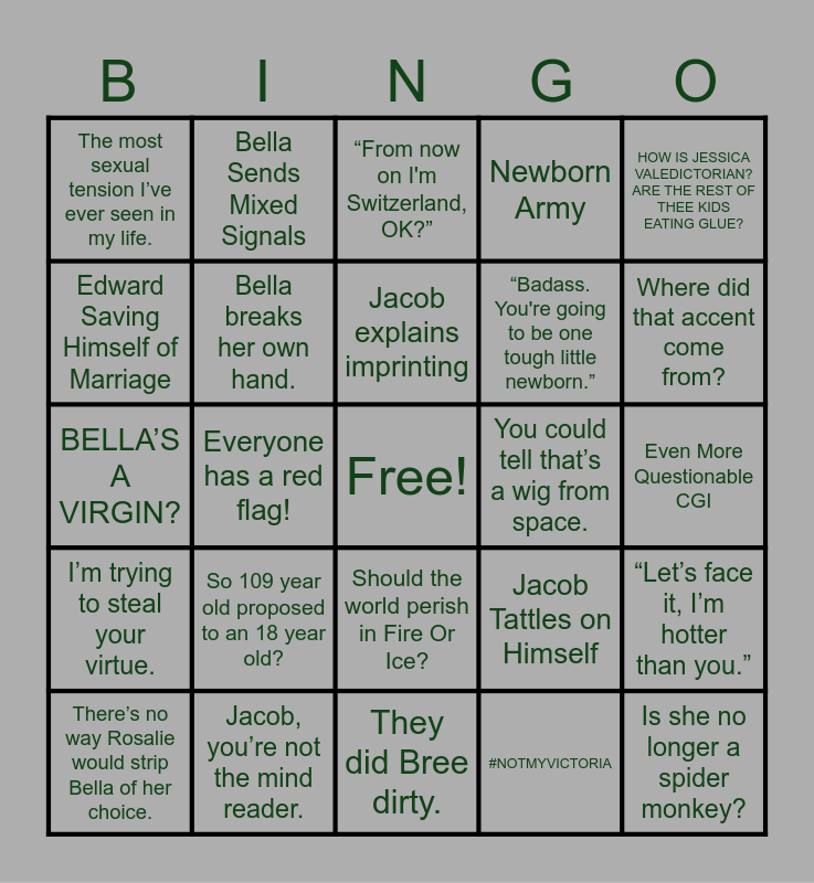 This bingo card has a free space and 26 words: Should the world perish in Fire Or Ice?, #NOTMYVICTORIA, Jacob explains imprinting, Jacob, you’re not the mind reader., HOW IS JESSICA VALEDICTORIAN? ARE THE REST OF THEE KIDS EATING GLUE?, The most sexual tension I’ve ever seen in my life., Edward Saving Himself of Marriage, Bella Sends Mixed Signals, Even More Questionable CGI, Jacob Tattles on Himself, “Badass. You're going to be one tough little newborn.”, BELLA’S A VIRGIN?, “Let’s face it, I’m hotter than you.”, There’s no way Rosalie would strip Bella of her choice., Everyone has a red flag!, You could have given Jasper any back story in the world, and you choose THE WRONG SIDE OF THE WAR?, Newborn Army, I’m trying to steal your virtue., “From now on I'm Switzerland, OK?”, Is she no longer a spider monkey?, Where did that accent come from?, They did Bree dirty., You could tell that’s a wig from space., So 109 year old proposed to an 18 year old?, Bella breaks her own hand. and Charlie finds out about the engagement..