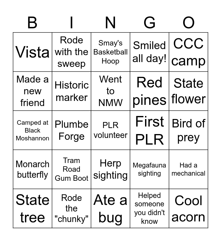 This bingo card has a free space and 24 words: Tram Road Gum Boot, Rode the "chunky", Went to NMW, State tree, CCC camp, Vista, Made a new friend, Rode with the sweep, First PLR, Herp sighting, Red pines, Camped at Black Moshannon, Megafauna sighting, Had a mechanical, Historic marker, Helped someone you didn't know, Bird of prey, Smay's Basketball Hoop, State flower, Plumbe Forge, Cool acorn, Monarch butterfly, Smiled all day! and Ate a bug.
