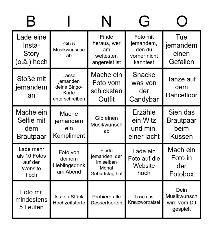 This bingo card has 25 words: Foto von deinem Lieblingsdrink am Abend, Probiere alle Dessertsorten, Mache ein Foto vom schicksten Outfit, Foto mit mindestens 5 Leuten, Tue jemandem einen Gefallen, Lade eine Insta-Story (o.ä.) hoch, Stoße mit jemandem an, Gib 5 Musikwünsche ab, Erzähle ein Witz und min. einer lacht, Finde jemanden, der im selben Monat Geburtstag hat, Snacke was von der Candybar, Mache ein Selfie mit dem Brautpaar, Lade ein Foto auf die Website hoch, Mach ein Foto in der Fotobox, Lasse jemanden deine Bingo-Karte unterschreiben, Dein Musikwunsch wird vom DJ gespielt, Sieh das Brautpaar beim Küssen, Finde heraus, wer am weitesten angereist ist, Tanze auf dem Dancefloor, Mache jemandem ein Kompliment, Gib einen Musikwunsch ab, Iss ein Stück Hochzeitstorte, Lade mehr als 10 Fotos auf der Website hoch, Foto mit jemandem, den du vorher nicht kanntest and Löse das Kreuzworträtsel.